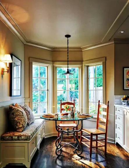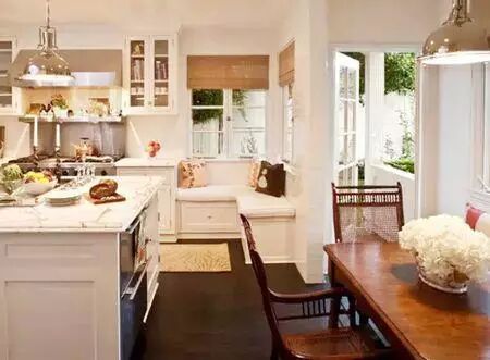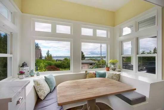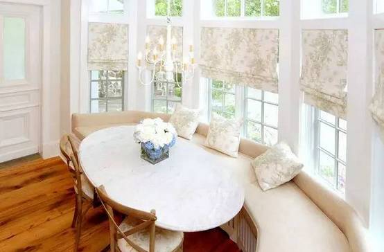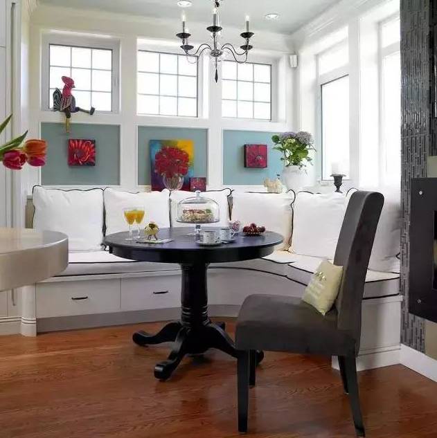 说实话,这在中国普通家庭中不太可能实现,若你家够大,你够爱干净,可以试试在餐厅里来一个飘窗,一家人紧挨坐下来吃饭的感觉太温馨了。