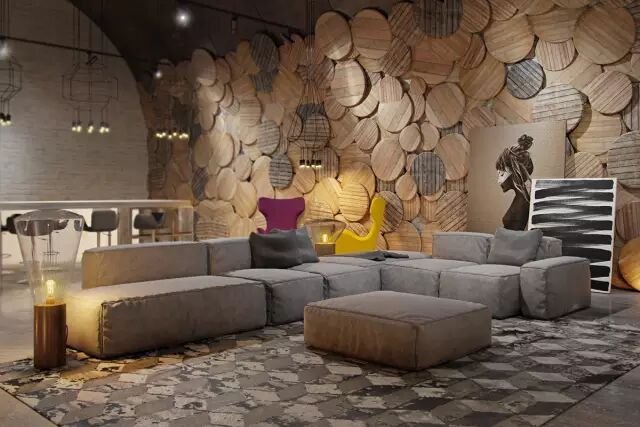 设计师在这面墙的处理时使用了垂直对齐和颜色变化,来创造一个质朴的条纹艺术感,戏剧性的灯光给中性色调的空间营造一种神秘而放松的氛围。
