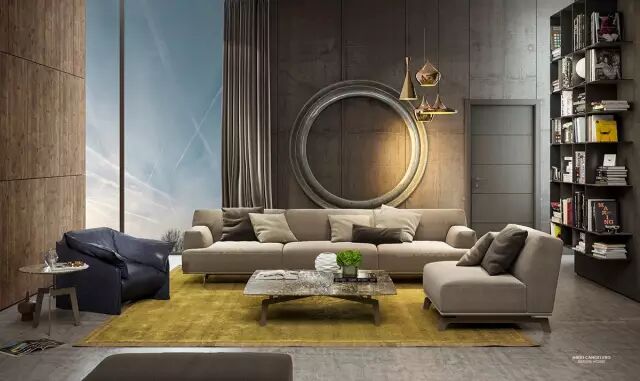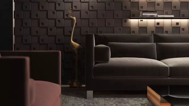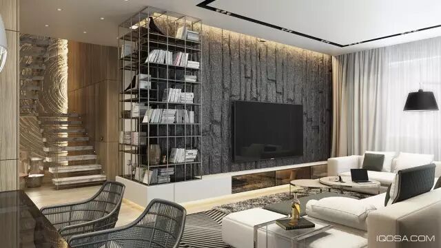这一间客厅独特纹理的墙面为空间营造极其优雅的氛围,而戏剧性的照明创造的视觉景观也是一流的zan。
