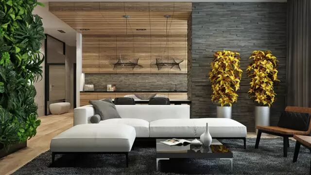 开放式的客厅用细长的木板和粗糙的石头来吸引到访客人的眼球,一直延续到厨房挡板和天花板。