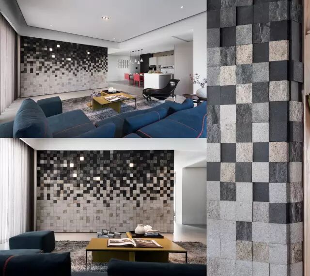 瓷砖看起来不再冰冷,柔软的像毯子一样,阿联很想去抚摸一下,从木炭色到棕色到灰色,深度不一、纹理丰富的马赛克墙面成了客厅的焦点。