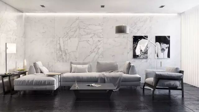 对,选的前几个案例都是石材类,偏简约!明亮的白色大理石瓷砖让整个单色客厅看起来更加豪华、干净。