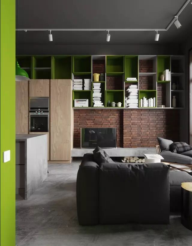 喜欢工业风格的设计师就喜欢砖墙裸露的样子,但是又不甘于平凡,白色与绿色的储藏柜丰富空间的同时增加了现代感。