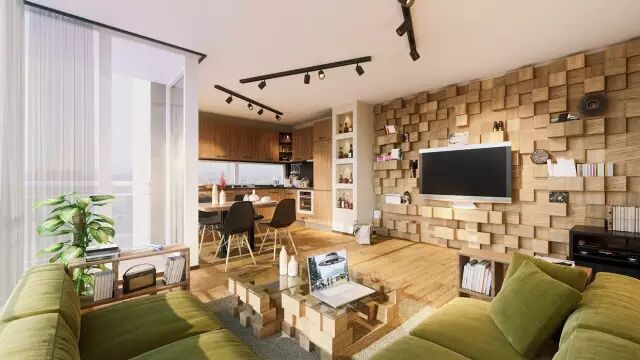 这些六角形拼接出的艺术墙看起来很舒服,温暖的的木色调丰富了单色调的空间。